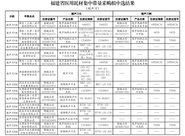 从中选结果可以看到,超声刀类耗材拟中选企业包括强生、奥林巴斯、天津瑞奇、北京速迈以及武汉半边天等械企;