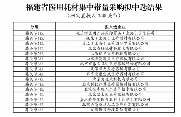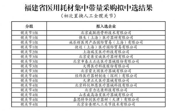 据了解,7月10日福建省医保局发布耗材集中带量采购的结果通知,涉及人工关节(包括人工全髋关节、人工膝关节)、留置针、超声刀、镇痛泵等4类耗材。
