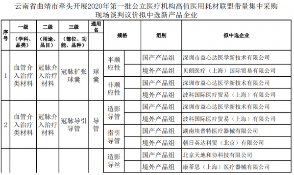 据了解,7月13日云南省曲靖市医用耗材联合采购办公室发布公示,已完成2020年第一批公立医疗机构高值医用耗材联盟带量集中采购第一批次现场谈判议价。