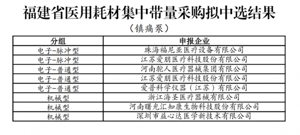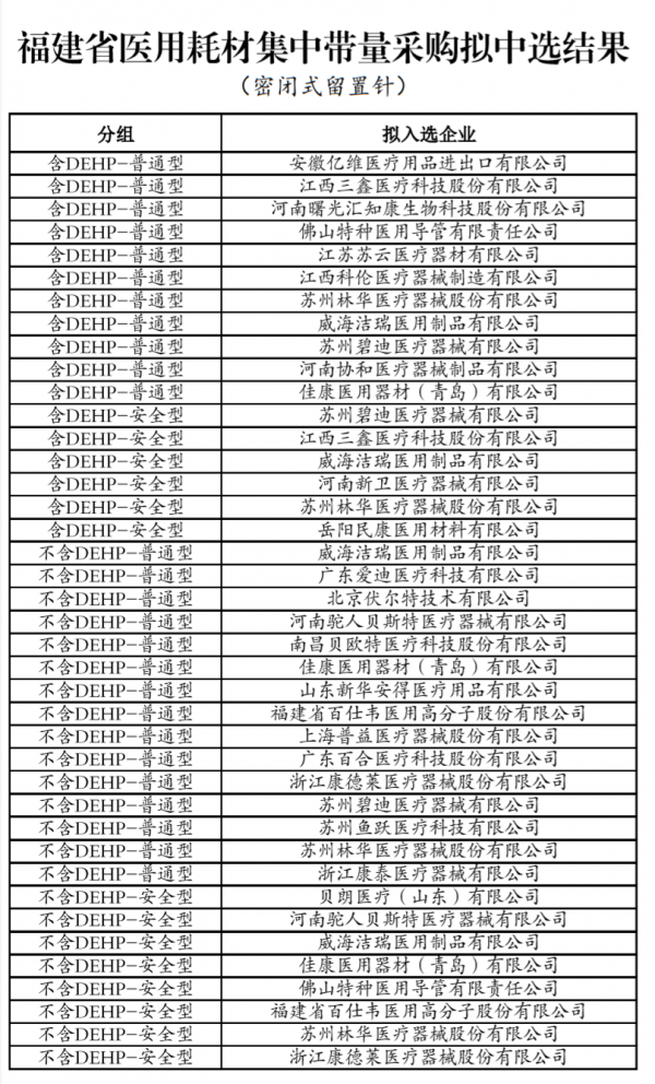 密闭式留置针拟中选企业包括BD、山东新华安得、三鑫医疗、苏州鱼跃等械企;镇痛泵拟中选企业包括、江苏爱朋、河南驼人、珠海福尼亚等械企。