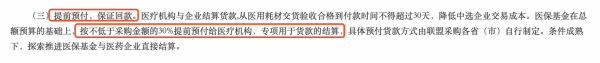 在回款上,医疗机构与企业结算货款,从医用耗材交货验收合格到付款时间不得超过30天,降低中选企业交易成本。医保基金在总额预算的基础上,按不低于采购金额的30%提前预付给医疗机构,专项用于货款的结算,具体预付货款方式由联盟采购各省(市)自行制定。
