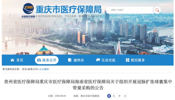 8月4日,贵州省、重庆市、海南省的医保局发布了《关于组织开展冠脉扩张球囊集中带量采购的公告》,采购的品种是冠脉扩张球囊(仅限预扩球囊和后扩球囊)。