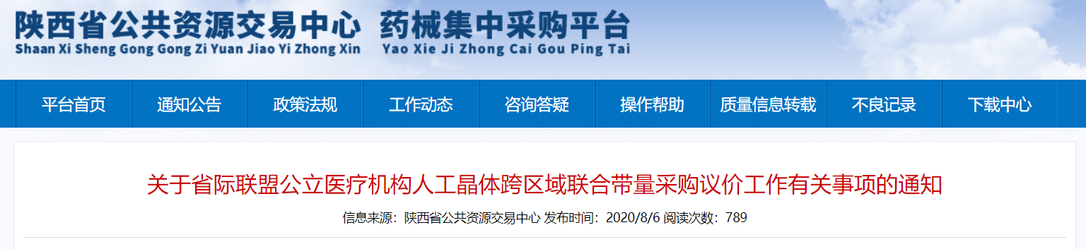 8月6日,陕西省公共资源交易中心发布《关于省际联盟公立医疗机构人工晶体跨区域联合带量采购议价工作有关事项的通知》(下称《通知》),公示量采购采购产品分组及械企对应的申报价格。