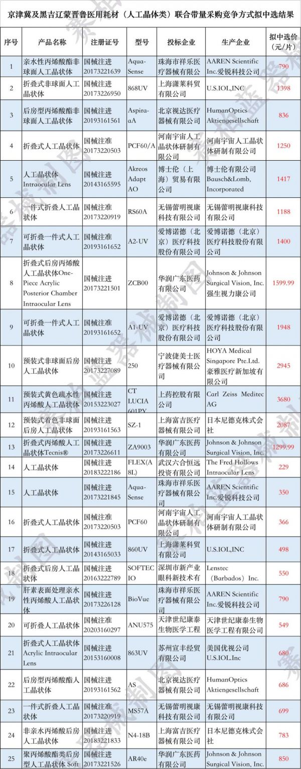今年5月,京津冀及黑吉辽蒙晋鲁医药联合采购办公室公布人工晶体类耗材中选结果,中选企业包括强生视力康、爱博诺德、美国爱尔康、无锡蕾明视康等企业(文末附中标企业及价格名单)。