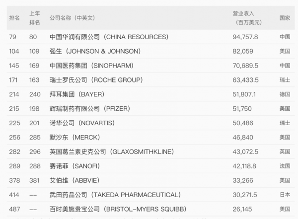 2020年《财富》世界500强中被归为制药领域的上榜企业