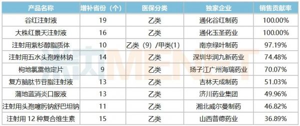 20个销售额超10亿并进入5个(含)以上省级医保目录的产品中有9个为独家产品,这些产品对于企业的业绩贡献率举足轻重:步长旗下的谷红注射液及复方脑肽节苷脂注射液、绿叶制药旗下的注射用紫杉醇脂质体、华润三九旗下的注射用五水头孢唑林钠、扬子江旗下的枸地氯雷他定片以及通化玉圣药业的大株红景天注射液销售贡献率超过50%,济川的蒲地蓝消炎口服液、湘北威尔曼制药的注射用头孢噻肟钠舒巴坦钠、誉衡旗下的注射用12种复合维生素的销售贡献率也超过30%。
