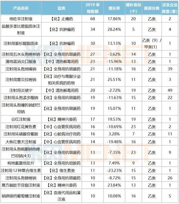 上述产品在2019年年底前进入20个(含)以上省级医保目录的有3个,分别为:地佐辛注射液、注射用红花黄色素以及注射用头孢哌酮钠他唑巴坦钠(4:1)。若能顺利成为新增药品,早前害怕丢失的巨大市场就能保住了。