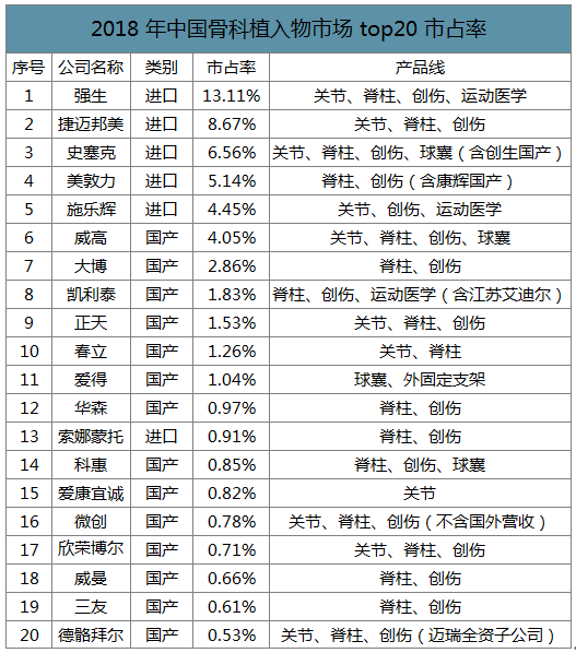 中国产业信息网数据显示,2018年在中国骨科植入物市场,前20名有6家是进口厂家,其中top5均为进口厂家,分别为强生13.11%、捷迈邦美8.67%、史赛克6.56%、美敦力5.14%、施乐辉4.4%,集中度CR5为37.93%,占据绝对优势。