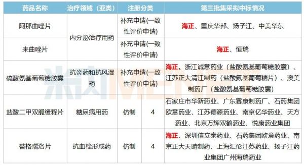 截至目前,海正药业及子公司共有14个产品已过评(含瀚晖制药已过评的4个产品),其中5个产品参与第三批国家集采竞标,阿那曲唑片、来曲唑片、硫酸氨基葡萄糖胶囊、替格瑞洛片拟中选,而盐酸二甲双胍缓释片则失之交臂。
