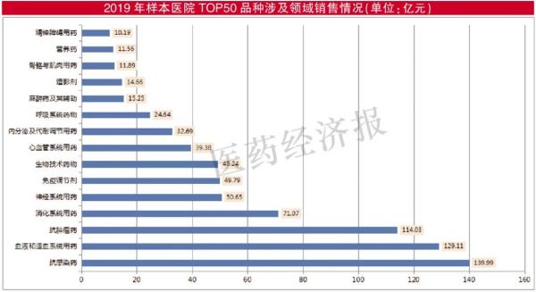 TOP50品种涉及的领域有:抗感染药用药金额139.99亿元,血液和造血系统用药129.11亿元,抗肿瘤药114.03亿元,消化系统用药71.07亿元,神经系统用药50.65亿元,其它几个领域(免疫调节剂、生物技术药物、心血管系统用药、内分泌及代谢调节用药、呼吸系统药物、麻醉药及其辅助造影剂、骨骼与肌肉用药、营养药、精神障碍用药)合计用药金额259.29亿元。