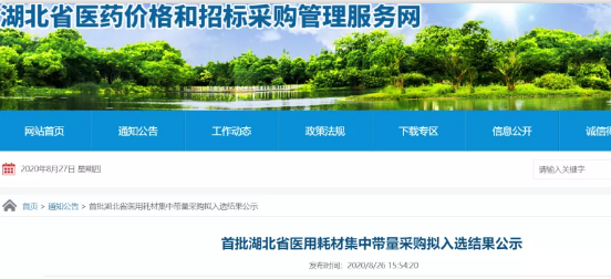8月26日,湖北省医药价格和招标采购管理服务网发布《首批湖北省医用耗材集中带量采购拟入选结果公示》(下称《公示》),对冠脉扩张球囊、一次性使用精密输液器、医用胶片三大类耗材的中标结果和价格进行公示。