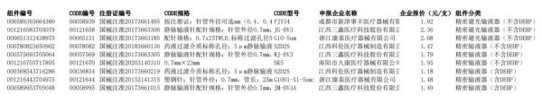 一次性使用精密输液器拟中选企业包括成都市新津事丰医疗器械有限公司、江西三鑫医疗科技股份有限公司、浙江康泰医疗器械有限公司等,上述三家企业报价分别为1.92元、2.36元、2.68元。