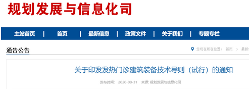 8月31日,国家卫健委规划发展与信息化司发布《发热门诊建筑装备技术导则(试行)》(下称《技术导则》),适用于医院发热门诊的新建、改建和扩建项目。