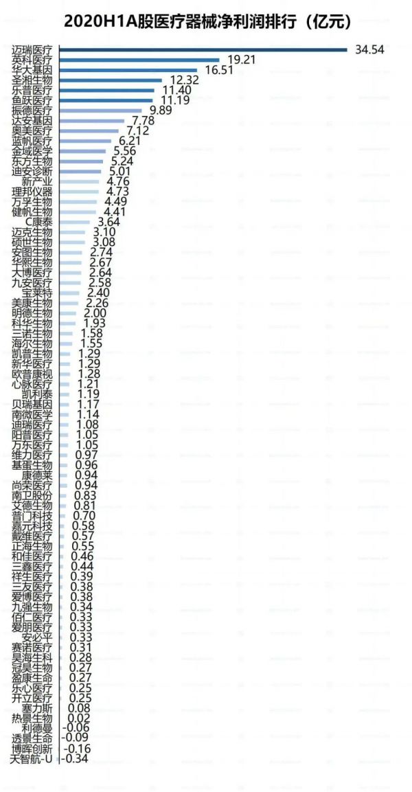 在净利润上,迈瑞医疗34.54亿元位列第一;圣湘、乐普和鱼跃3家净利润均超在10亿。但有4家净利润亏损。