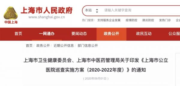 9月1日,上海市人民政府发布《上海市公立医院巡查实施方案(2020-2022年度)》。