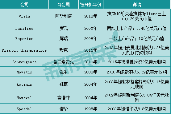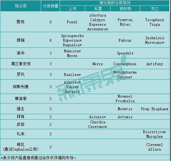据统计,有39家此类公司走上了独立的发展之路,从母公司及拆分时间看,它们大都是在过去10年间从12家全球大型制药商中拆分出来的。其中,10家已成功上市,8家仍为私有企业,11家已被收购,剩余10家要么破产、要么似乎不再活跃。