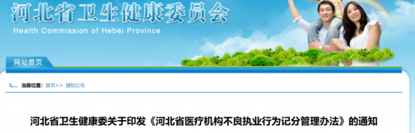9月10日,河北省卫健委发布《关于印发<河北省医疗机构不良执业行为记分管理办法>的通知》(以下简称《管理办法》)。