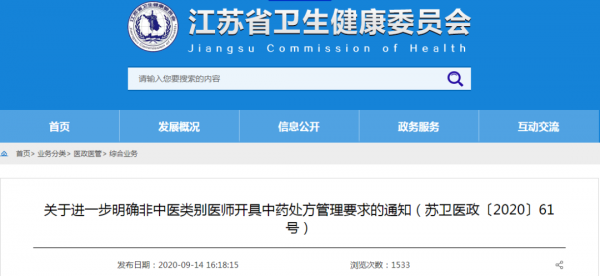 9月14日,江苏省卫健委发布《关于进一步明确非中医类别医师开具中药处方管理要求的通知》,相比国家层面的政策,江苏放宽了对非中医类别医师开具中药的要求,意在推进中医药事业快速发展,发挥中医药在治未病、疾病治疗和康复中的重要作用。
