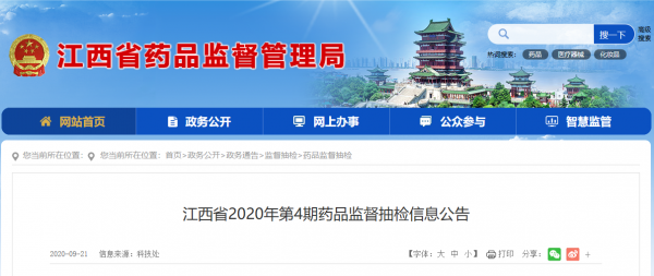 9月21日,江西省药监局公布了《江西省2020年第4期药品监督抽检信息公告》(以下简称《公告》)。