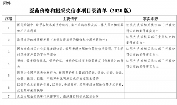 国家医保局建立医药价格和招采失信事项目录清单,将医药商业贿赂、涉税违法等有悖诚实信用的行为纳入清单中,并对药企通过清单所列行为牟取不正当利益的行为纳入药价和招采信用评价范围。