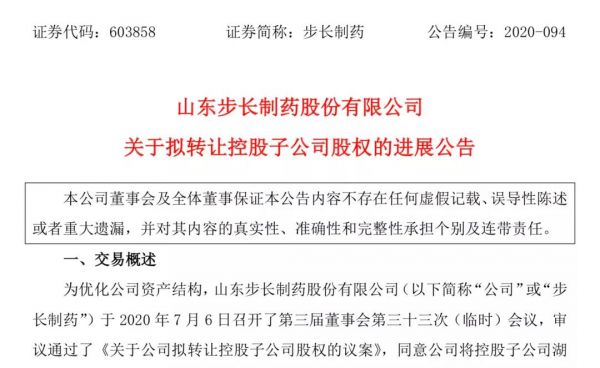 9月21日,山东步长制药发布进展公告,为优化公司资产结构,山东步长制药股份有限公司(以下简称“步长制药”)审议通过了《关于公司拟转让控股子公司股权的议案》,同意公司将控股子公司湖北步长九州通医药有限公司(以下简称“湖北步长九州通”)51%股权以2175.2万元转让给九州通医药集团股份有限公司(以下简称“九州通”)。
