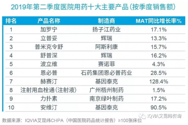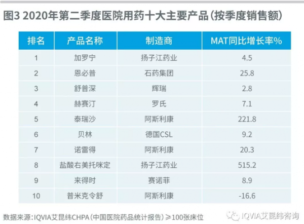 IQVIA公布了2020年第二季度医院用药十大主要产品。