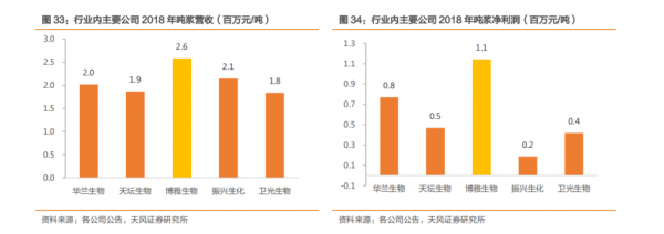 根据年报披露,博雅生物预计于2021年建成“千吨级血液制品智能工厂建设项目”并完成 GMP 认证,实现后续血浆产能的扩张。而2017年博雅生物与高特佳共同收购的丹霞生物也将为其带来采浆量的进一步提升。丹霞生物拥有 25 个站点,其中 17 个单采血浆站,是目前血液制品单体企业浆站数量最多的企业。胡博新表示一旦丹霞生物相关审批得以解决,博雅生物有望跻身千吨浆量梯队,实现国内血液制品千吨浆企业格局“由4变5”。