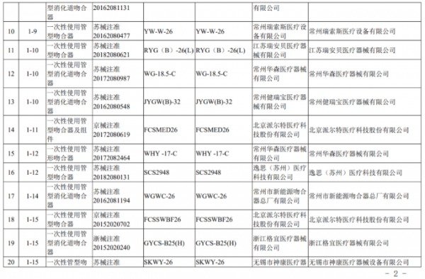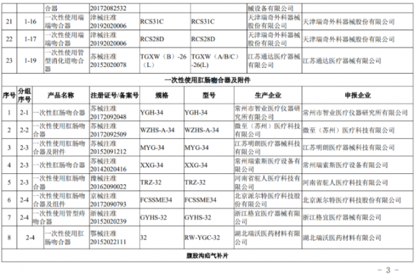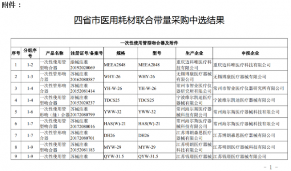 一次性使用肛肠吻合器及附件中选企业包括常州市智业、河南省驼人、江苏明朗等械企;