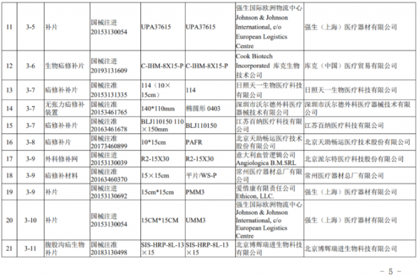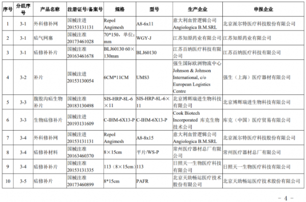 腹股沟疝气补片中选企业包括强生、库克、北京派尔特、北京天助畅运等械企;