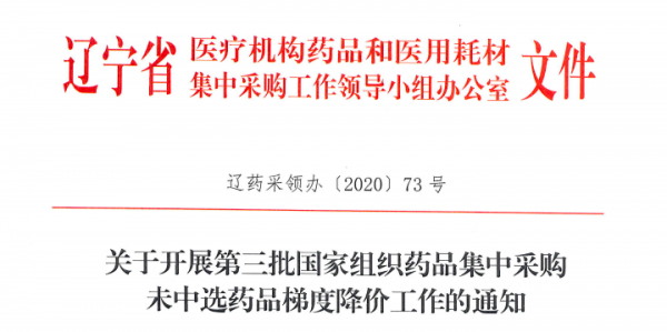 10月13日,辽宁省药品和医用耗材集中采购网发布《关于开展第三批国家组织药品集中采购未中选药品梯度降价工作的通知》。