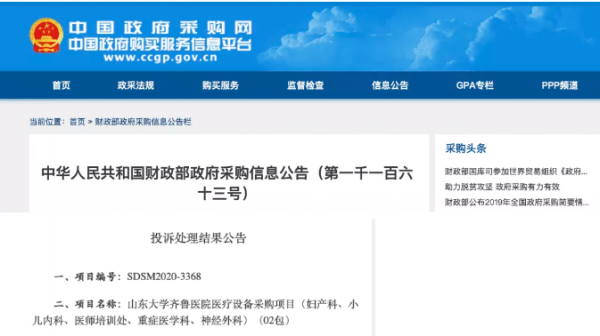 投诉处理公告显示,山东大学齐鲁医院医疗设备采购项目(妇产科、小儿内科、医师培训处、重症医学科、神经外科)(02包)中,投诉人因对代理机构就本项目作出的质疑答复不满,向财政部提起投诉。