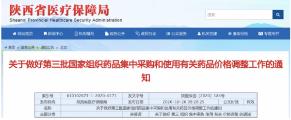 10月26日,陕西省医保局发布《关于做好第三批国家组织药品集中采购和使用有关药品价格调整工作的通知》。