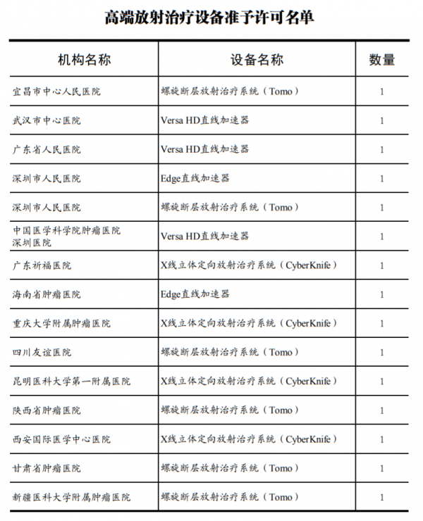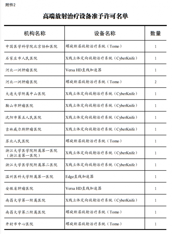 4.高端放射治疗设备。到2020年底,全国规划配置216台,其中新增188台。