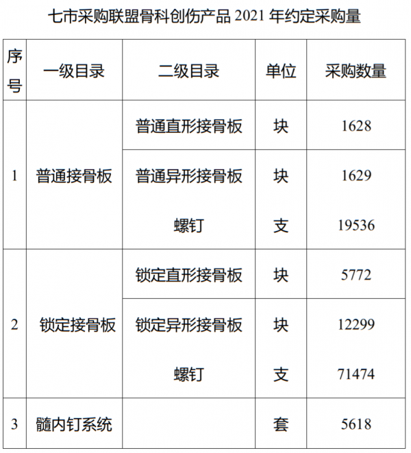 带量采购产品为骨科创伤和血液透析两大类。其中骨科创伤类产品具体包括普通接骨板、锁定接骨板和髓内钉系统,总采购数量为11.8万个。