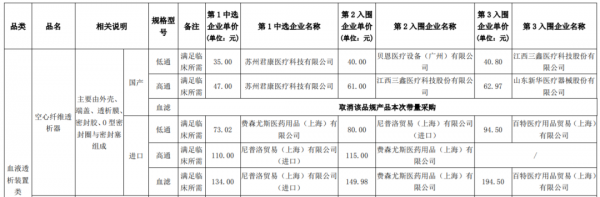 从上述两个品种耗材来看,国产产品价格分别是进口产品的49.7%和42.7%,此外,血滤器只有进口品牌入围。