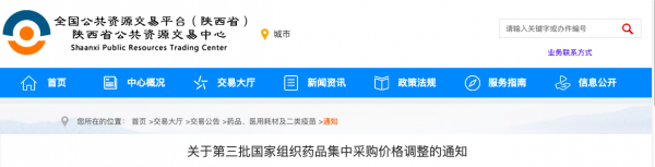 近日,陕西省公共资源交易中心发布《关于第三批国家组织药品集中采购价格调整的通知》指出,同品种同剂型同规格药品在陕西省挂网的过评企业超过(含)3家的,对应的未过评产品将予以剔除。
