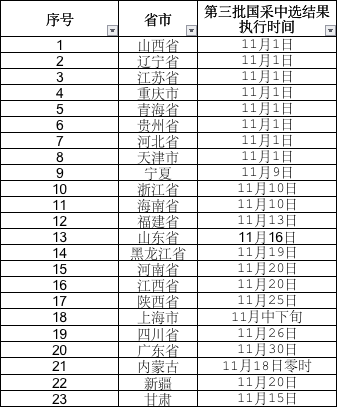 截至今日,据赛柏蓝梳理,共23个省市明确了执行第三批国采结果的时间,其中8省市均于11月1日起执行,分别是辽宁、江苏、山西、青海、贵州、重庆、河北、天津;另外15省市,宁夏、黑龙江、福建、河南、陕西、上海、海南、四川、江西、浙江、广东、山东、内蒙古、新疆、甘肃均于11月中下旬执行第三批国采中选结果——其中,最晚的是广东,开始执行第三批国采结果的时间为11月30日。