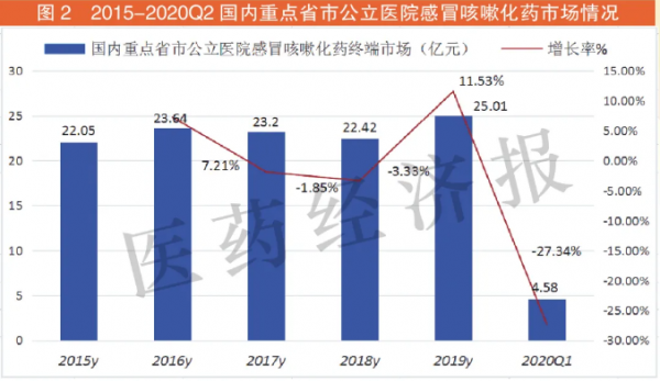 米内网数据显示,2019年国内重点省市公立医院终端感咳化药制剂市场规模为25亿元,同比上一年增长率为11.53%。进入2020年一季度,受新冠肺炎疫情影响,医院诊疗量减少,处方量及药品销量急转直下。另一方面,抗流感中成药口服制剂连花清瘟胶囊、金花清感颗粒、荆防颗粒热销,2020年一季度感冒咳嗽化药市场降温。