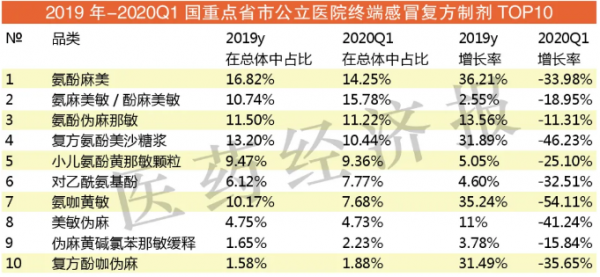 2019年,国内重点省市公立医院终端感冒复方制剂市场TOP10药品是:氨酚麻美、氨麻美敏/酚麻美敏、氨酚伪麻那敏、复方氨酚美沙糖浆、小儿氨酚黄那敏颗粒、对乙酰氨基酚、氨咖黄敏、美敏伪麻口服液、伪麻黄碱氯苯那敏和复方酚咖伪麻。这10个药物销售额合计为2.66亿元,同比上一年增长了18.05%。