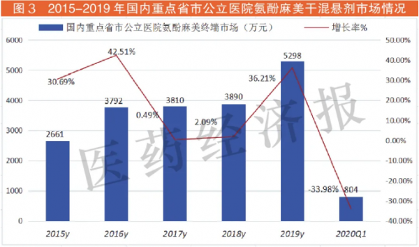 米内网数据显示,2019年国内重点省市公立医院终端复方氨酚美沙糖浆市场规模为4100多万元,同比上一年增长率为31.89%,在公立医院终端感冒复方制剂TOP10品种市场中占据了13.20%。2020年一季度相比上一年同期下滑了46.23%,用药金额近600万元。