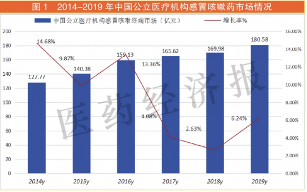 中国公立医疗机构感冒、咳嗽终端市场平稳增长,在2019年城市公立医院、县级公立医院、城市社区中心及乡镇卫生院四大终端用药金额同比增长3.61个百分点。