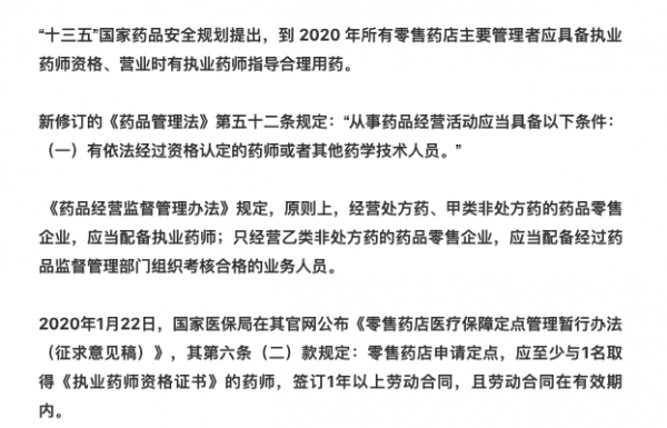 从国家药监局的通知明确以2025年为期看,最晚到2025年,全国范围内的零售药店有望实现足额配备执业药师。