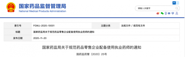 近日,国家药监局正式发布《关于规范药品零售企业配备使用执业药师的通知》(以下简称《通知》),《通知》自2021年1月1日起实施。