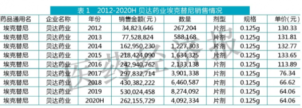 数据显示,贝达药业的埃克替尼样本医院销售价格从133元左右降至76元,降幅达43%,带来的是销售量大幅上升,2019年销售量接近2016年的4倍,销售额也增长了1倍多。
