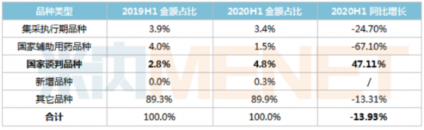 米内网数据显示,2020上半年尽管在疫情的冲击下,国家谈判品种的销售额仍呈现出快速的增长势头,同比增长了47.11%,销售额占比也由2019上半年的2.8%上升至2020上半年的4.8%,可见该类品种以价换市场的通道得以打开,市场发展空间较大。