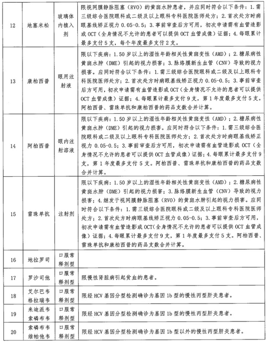 值得注意的是,此次福建医保部门也非常重视药品合规使用。除了在文件里明确“要加强对单列门诊统筹支付的医保药品使用的监测,督促定点医疗机构实现规范上传诊疗相关信息,促进单列门诊统筹支付药品规范、合理使用”外,在支付范围的细则中也有所体现。以治疗黄斑水肿的抗VEGF眼科药物为例,此次被福建列入单列门诊统筹支付的包括了康柏西普、阿柏西普和雷珠单抗。