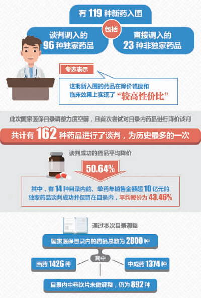 此次国家医保目录调整力度空前,且首次尝试对目录内药品进行降价谈判。共计有162种药品进行了谈判,为历史最多的一次。最终有119种药品谈判成功,谈判成功率为73.46%。谈判成功的药品平均降价50.64%。
