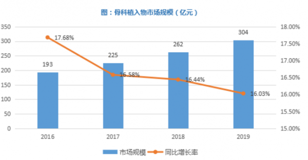 得益于我国庞大的人口基数、社会老龄化进程加速和医疗需求不断上涨,加之进口替代的大背景,骨科行业持续高度景气。据Eshare医械汇测算,2019年骨科植入市场规模约为304亿元,增长率为16.03%。