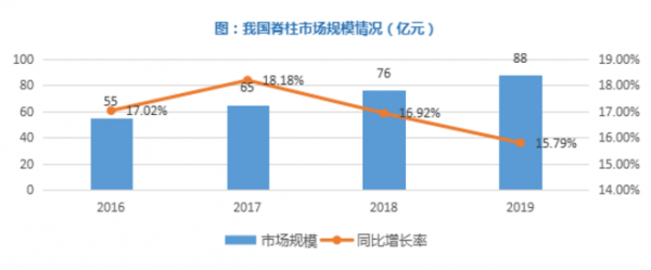 脊柱被称之为人体的“第二生命线”,是人体的“支柱与栋梁”。随着老龄化的加剧,脊柱领域的发病率越来越高,比如颈椎病、骨质疏松、腰椎间盘突出等等,并呈现出年轻化趋势。据Eshare医械汇测算,2019年脊柱市场销售规模约为88亿元,较2018年增长15.79%,脊柱市场保持高速增长。