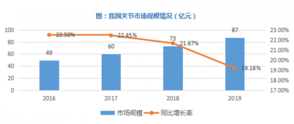 据Eshare医械汇测算,2019年关节市场销售规模约为87亿元,较2018年增长19.18%。另外,据了解,我国关节手术患者满意率不高,并且非常依赖医生的经验和手术技巧,而稳定性、精准度都较高的骨科机器人则是可以解决这一问题。